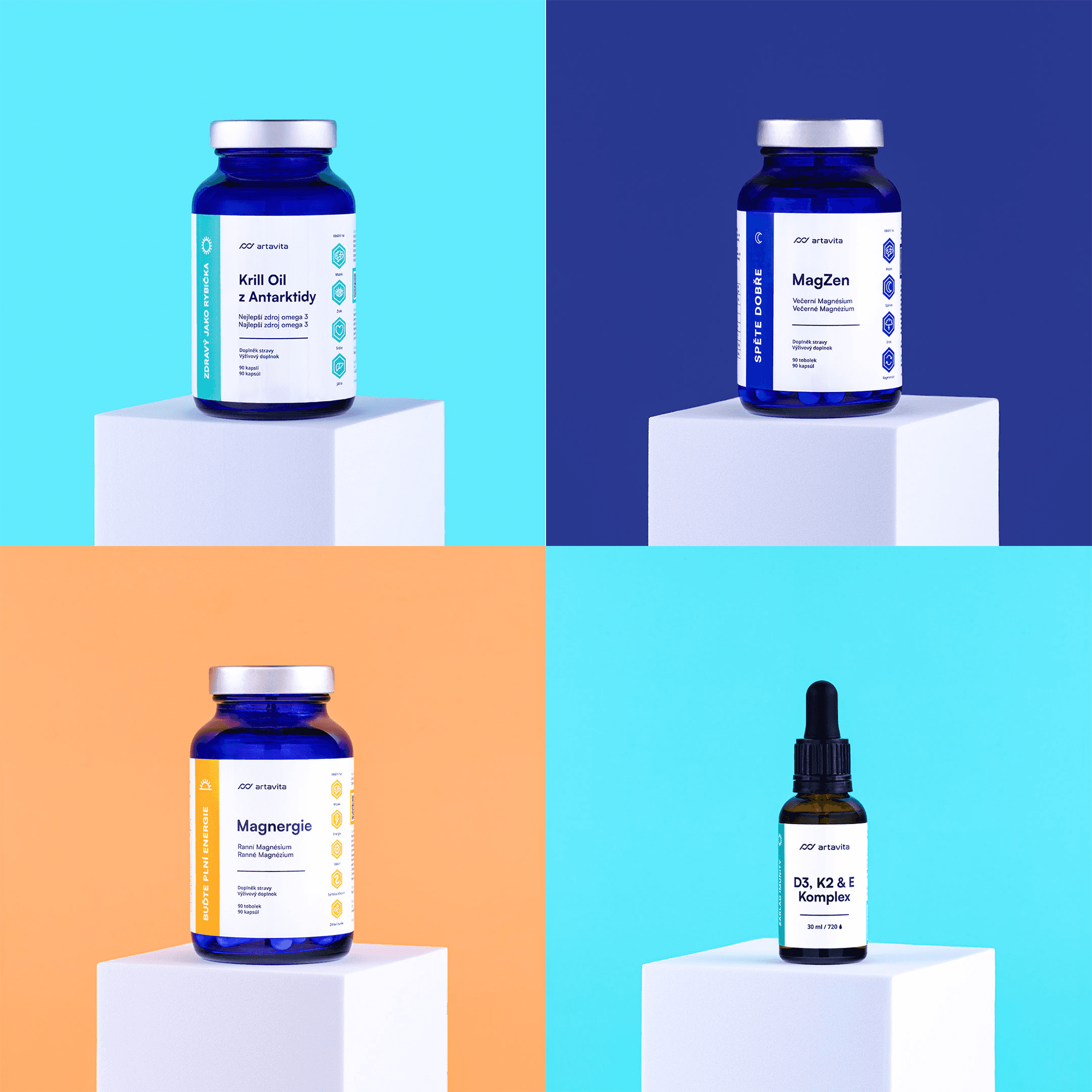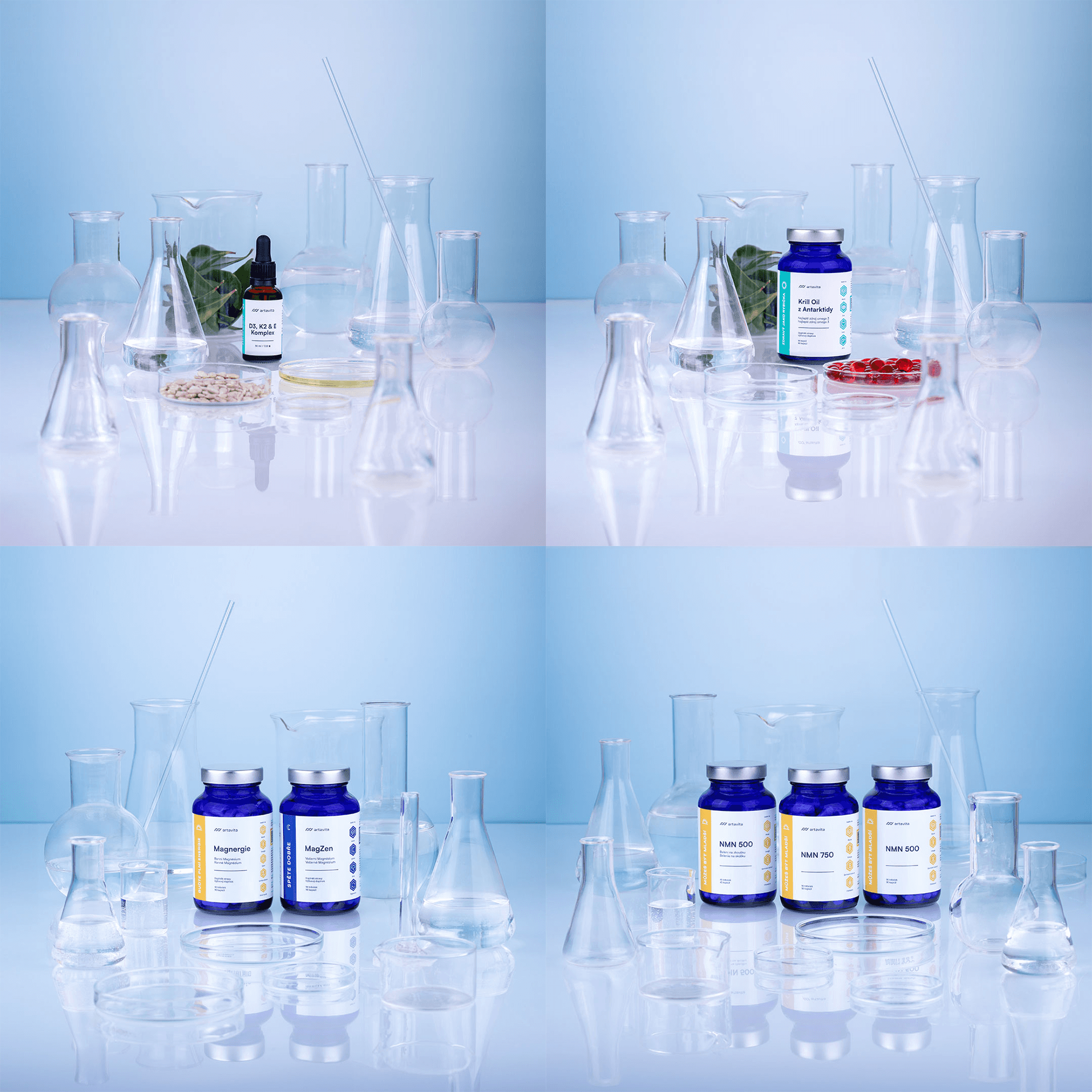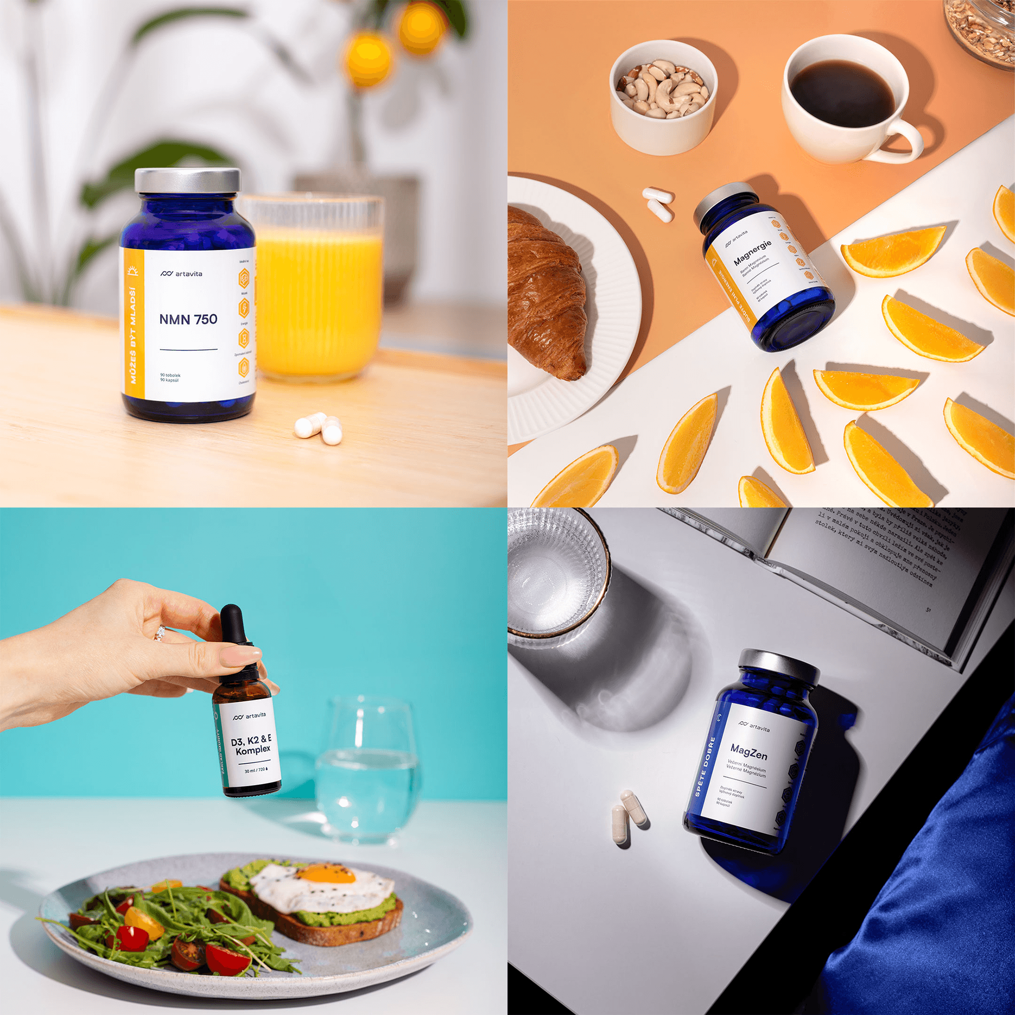 Artavita je značka prémiových doplňků stravy, pro kterou jsem vytvářela vizuální prezentaci produktů. Vedle klasických produktových fotografií na bílém pozadí vznikly také kreativnější formy prezentace a lifestyle fotografie určené nejenom pro komunikaci na sociálních sítích. Vzhledem k důrazu značky na výzkum a kvalitu jednotlivých složek jsem stylizovala vizuální styl produktových fotografií do precizního, laboratorně inspirovaného prostředí. Lifestyle fotografie naopak pracovaly s přirozeným zasazením produktů do každodenních situací – ke snídani, k jídlu nebo před spaním. Společně s klientem jsme definovali mood jednotlivých typů fotografií a rozsah výstupů, zatímco samotná kreativní realizace zůstala plně v mé režii.
